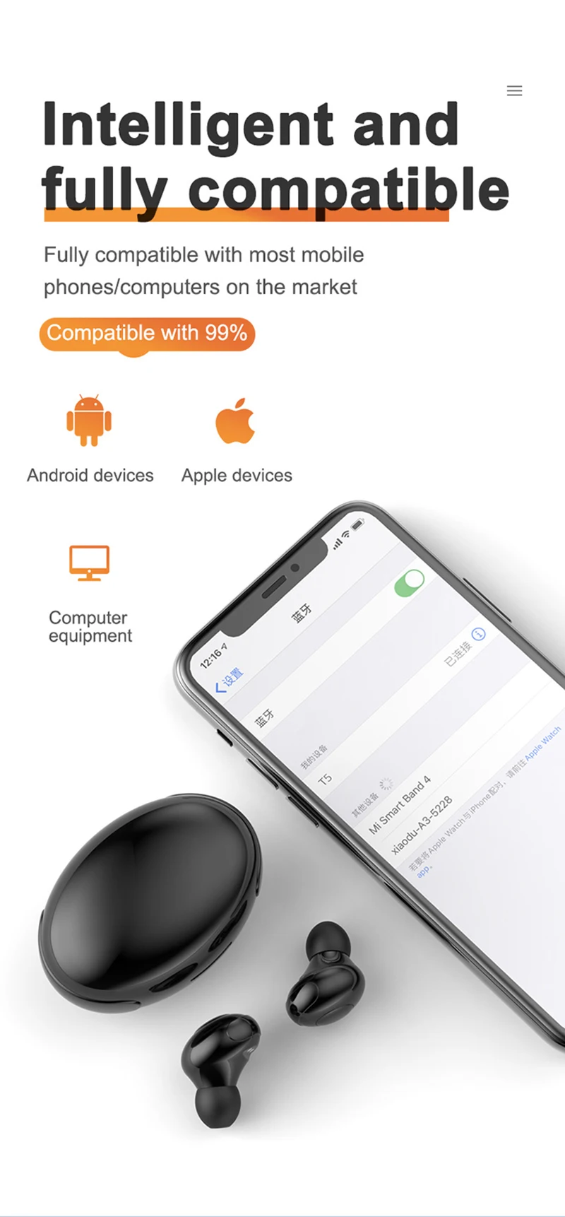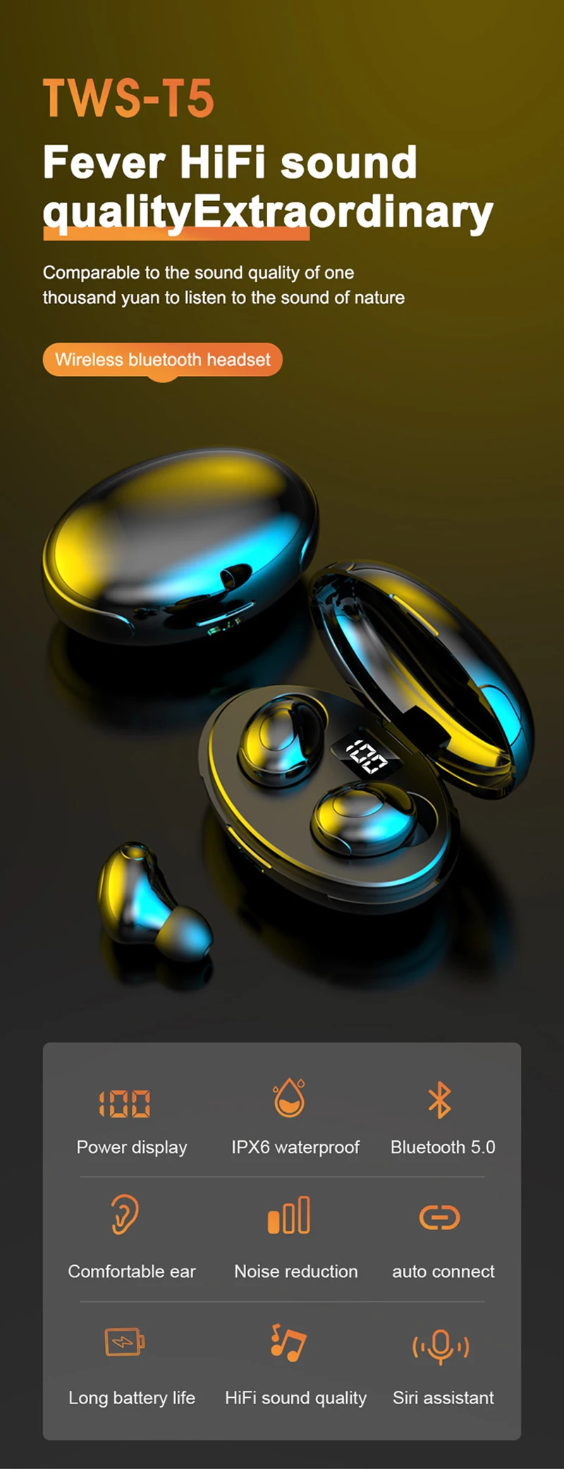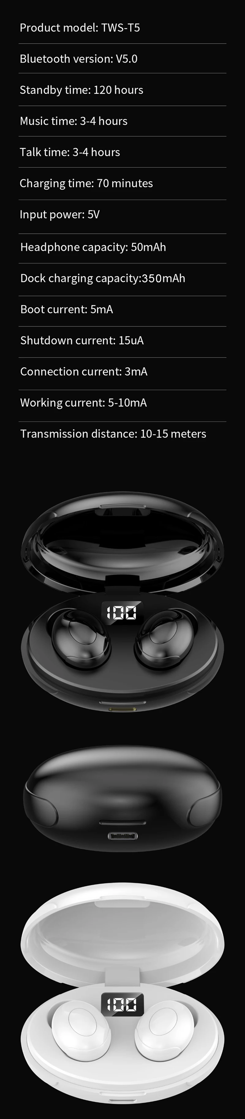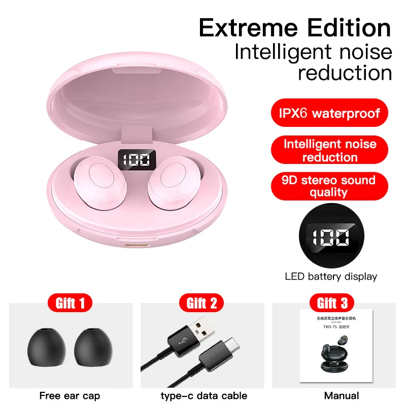 TWS HiFi Sound T5 Bluetooth Headset with Digital DIsplay Charging